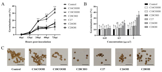 We further investigated compounds of the wax in the bud on the germination of smut teliospores. Pure wax components representing fatty acids, alkanes, alkanols, and alkanals were used to treat the teliospores in vitro. In time course experiments from 24 to 72 h, hexacosanol and octacosanol distinguished themselves from the other compounds in positively stimulating the spore germination, while C27 distantly followed, and no effect was observed for palmitic acid, stearic acid, heptacosane, or octacosanal (Figure 4A). In concentration gradients of 5 μg/cm2, hexacosanol and octacosanol showed significant difference from the other compounds in positively stimulating the spore germination (Figure 4B).