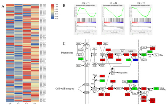 Expression and gene set enrichment analysis (GSEA) of genes in the MAPK signaling pathway. (A) Heatmap of gene expression in the MAPK signaling pathway. (B) GSEA analysis results for CK vs. T1, CK vs. T2, and CK vs. T3, respectively. The MAPK signaling pathway was significantly upregulated in T2 and T3 (p < 0.05). (C) Differentially expressed genes of CK vs. T2 in the MAPK signaling pathway. Thirty-three of these DEGs were upregulated, and nine were downregulated. Genes in the red, green, and blue boxes denote upregulated, downregulated, and both up- and downregulated in CK vs. T2, respectively.