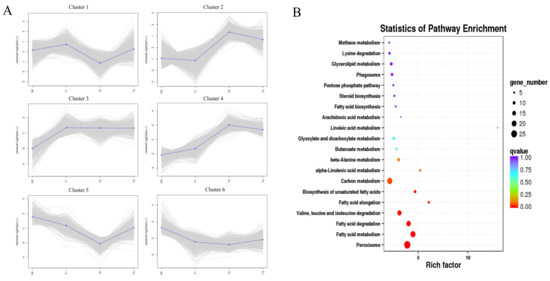 Trend analysis of gene co-expression and KEGG enrichment analysis of cluster 3. (A) k-means analysis of all gene expression profiles was conducted to obtain six clusters. (B) Kyoto encyclopedia of genes and genomes (KEGG) enrichment analysis of cluster 3 showed that pathways of peroxisome; fatty acid metabolism; fatty acid degradation; valine, leucine, and isoleucine degradation; fatty acid elongation, and biosynthesis of unsaturated fatty acids were significantly enriched (p < 0.01).