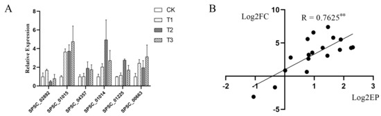 Three genes in the MAPK signaling pathway (SPSC_00663, SPSC_02892, and SPSC_04357) and three genes encoding alcohol dehydrogenase (SPSC_01014, SPSC_01015, and SPSC_01225) were selected for RT-qPCR to validate the expression profiles of the transcriptome. As shown in Figure 7, correlation coefficients of RNA-seq and RT-qPCR were 0.7625 (p < 0.01). The close relationship implied that sequencing data were reliable.