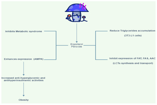 Pharmacological effects of ergosterol peroxide derived from mushrooms on obesity [38]. Ergosterol shows anti-obesity effect by reducing triglycerides accumulation, inhibiting expression of FAT, FAS, AAC, inhibiting metabolic syndrome, enhancing AMPK expression, increasing antihyperglycemic, and anti-hyperinsulinemic activities.