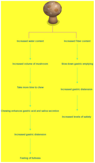 Mushrooms are widely used in foods, medicines, and nutraceuticals. Studies have shown the effect of A. bisporus (white button mushroom) consumption on food intake and satiety. Mushroom-and meat-based meals have equivalent protein content. However, they differ in portion size, fibre and carbohydrate contents, and calorie intake [47]. Despite having differences in the fibre content and portion size of sandwiches made of mushrooms and meat, consumption of a mushroom sandwich was more satisfying. However, there was no effect on energy intake. In a randomised controlled investigation of 32 members who consumed two servings of meat and mushrooms for 10 days, it was shown that replacing meat with mushrooms reduced the energy intake, resulting in weight reduction [70]. Studies have shown that mushrooms have higher water content than meat. Additionally, mushrooms require a longer time to chew. Chewing enhances gastric acid and saliva secretion, which leads to increased gastric distention and gives a feeling of fullness [70]. Mushrooms also have more fibre content, which upon consumption increases the food volume in the stomach, leading to an increased satiety. Mushrooms have both fermentable and non-fermentable fibres. Depending on the type of fibres, consuming mushrooms slows down gastric emptying, enhances gastric distention, and ultimately promotes satiation (Figure 2) [70]. Additionally, it has been reported that consumption of cholesterol obtained from the root of another mushroom called thunder, reduces appetite and results in weight loss. It decreases stress of the endoplasmic reticulum and reduces leptin resistance [71].