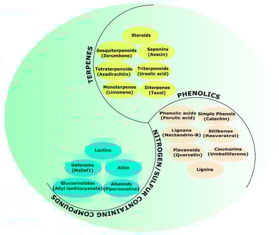 Plant-derived (botanical) protectants (PDPs) provide a competitive advantage over synthetic pesticides because they are safer and cheaper. We employ the term “plant-derived protectants” throughout this article to refer to purified active metabolites, crude plant extracts, essential oils, and total phytobiomass. They have multiple modes of action, are biodegradable, and reduced non-target toxicity [,,]. Regardless of the form of PDPs used, their pesticidal activity is mainly due to bioactive secondary metabolites. Secondary metabolite synthesis is part of the plant’s defense strategy. These metabolites might play a crucial role in the health of the plant, but they predominantly act as plant defense agents []. In accordance with the biosynthetic principle, plant secondary metabolites can be divided into three main classifications, which are terpenes, phenolics, and nitrogen-containing chemicals (Figure 1) []. Terpenes are the most abundant and significant class of secondary metabolites. Monoterpenes are found in abundance in essential oils, which account for about 80% of the total []. Phenols are a class of chemical compounds with a wide range of sizes and miscibility in water and organic solvents. The single-substituted phenolic rings are typically found in simple phenolics, while the complex compounds have phenolic rings connected to several functional groups. Nitrogen-containing secondary metabolites are usually biosynthesised amino acid derivatives.