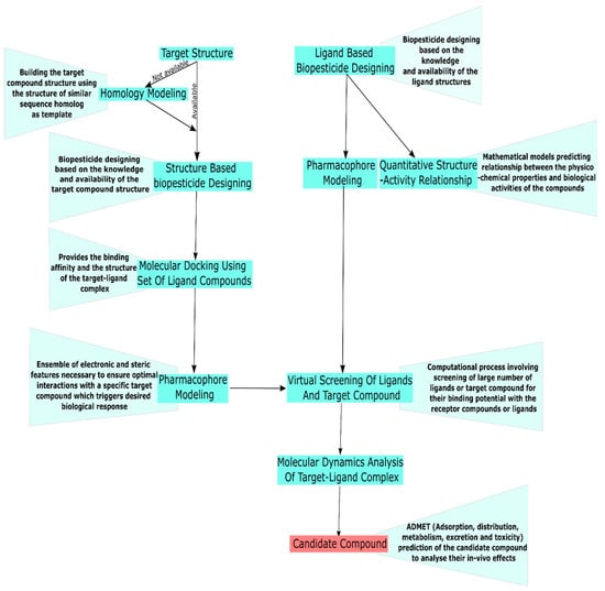 Thanks to the development of bioinformatics, scientists can use computer-aided technologies to screen antifungal compounds with knowledge obtained from genomic sequencing of the pathogens and computational work on the structures of antifungal compounds and the biological targets [,]. Such an in-silico approach has aided in the rapid screening of several antifungal chemicals. These computationally selected, natural antifungal chemicals rely on their binding affinity with the targeted virulent compounds. Virulence proteins involved in sterol, chitin, melanin, tubulin, and protein biosynthesis have been the target of interest for synthetic fungicides []. Researchers have shown interest in targeting virulence proteins linked to sterol, chitin, melanin, and tubulin biosynthesis []. Pathogenesis-related genes and their translational products involved in the cell wall or membrane degradation, melanin biosynthesis, phytotoxin synthesis, effector protein synthesis, and fungal cells growth/differentiation have been the major targets for these computational based studies [,,,]. The different processes of biopesticide design are illustrated in Figure 3. The 3D structure of required binding molecules can be obtained using special databases such as PubChem and ChEMBL [,].