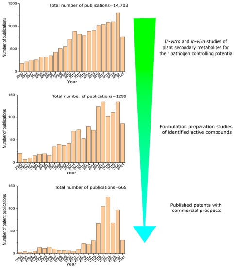 While PDPs have been touted as a safer and perhaps more effective alternative to synthetic pesticides, we need to delve deeper into the reasons behind their lack of market acceptance. The previous section briefly described various databases that include information on the structural properties of secondary plant metabolites. More than 200,000 plant secondary metabolites have been found, which is remarkable []. Additionally, a bibliographical search of the Scopus database was undertaken between 2000 and 2021. We performed the search by using different combinations of keywords: essential oil, plant extract, plant metabolite, plant secondary metabolite, plant bioactive compound, botanical, fungicide, antifungal, fungitoxic, bactericidal, bactriostatic, antiviral, formulation, emulsion, and suspension. Papers found through this search were restricted to the “articles” category. It is critical to recognise that this bibliographic search of relevant studies does not necessarily cover all research articles on the subject. The investigation has determined that over 14,500 published papers have been completed that examine the capability of various plant extracts, essential oils, and active metabolites to control plant disease pathogens (e.g., fungi, bacteria, and viruses) (Figure 4). Approximately 1300 investigations attempted to formulate the identified and extracted active chemicals into a useable form within the same period.