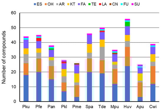 | 43 | Nonan-2-one | 821-55-6 | 1383 | KT | 0 | 49 ± 28 | 13 ± 4 | 0.5 ± 0.2 | 0.3 ± 0.1 | 2.3 ± 1.0 | 1.7 ± 0.4 | 1.3 ± 0.2 | 2.9 ± 1.0 | 5.2 ± 4.2 | 2.8 ± 0.6 | 0 |