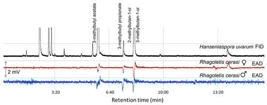 Mozūraitis, R.; Apšegaitė, V.; Radžiutė, S.; Aleknavičius, D.; Būdienė, J.; Stanevičienė, R.; Blažytė-Čereškienė, L.; Servienė, E.; Būda, V. Volatiles Produced by Yeasts Related to Prunus avium and P. cerasus Fruits and Their Potentials to Modulate the Behaviour of the Pest Rhagoletis cerasi Fruit Flies. J. Fungi 2022, 8, 95. https://doi.org/10.3390/jof8020095