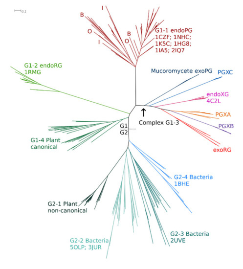 A preliminary ML tree (Figure 2) for the training set was obtained following sequence alignment and MSA trimming. All fungal GH28 sequences cluster in complex clade G1, with hierarchic subclustering of functional classes, whereas bacterial PGs cluster in clade G2. Plant PGs appear in two subclades, G1-4 and G2-1, hence in each of the two major clades. GH28, most likely, did evolve in plants, where its substrate is found, and the tree topology suggests that two different homologues gave rise to fungal homologues in clade 1 and the bacterial homologues in clade 2. Insect and oomycete endoPGs are surprisingly indistinguishable from fungal endoPGs, which may imply moderately recent gene transfer events as has been suggested earlier [16,74], combined with a similar functional constraint. The treefile is in Supplementary Datafile S4.
