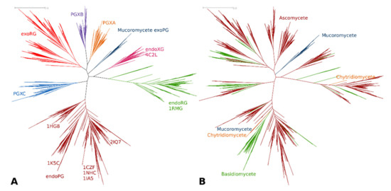 3.1. Phylogenetic Clustering of GH28 Is Explained by Taxonomy and Functional Diversification