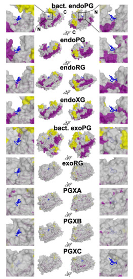 Since the PG, RG and XGs have different substrates, we also expect differences in the binding groove, other than those provided by additional loops. Then, exomode enzymes are different in the extent that they do not require +2 or +3 subsites. We performed evolutionary conservation analysis using Consurf [71,77] to see if the different subfamilies show differences in the conservation of the binding groove. Consurf basically calculates a ranking of conservation using the hierarchic structure of a phylogenetic tree, similar to evolutionary trace [48]. As such, it will identify trends in conservation in a hierarchic manner.