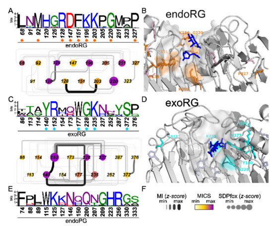 SDP identification in ascomycete endoRG and exoRG classes. (A,C) Sequence logos and subSDN of SDPs identified in the analyses endoPG vs. endoRG and endoPG vs. exoRG. Numbers correspond to the reference sequence of each subfamily: endoRG and exoRG. SDN-node colors represent the node’s MICS and the diameter corresponds to the SDPfox z-score. Edges thickness and darkness represent MI z-scores (see panel (F) for scales). (B,D) The identified SDPs were mapped on endoRG (B) and exoRG (D) reference structures aligned to 1KCD (galacturonate substrates in blue sticks). Highly conserved residues with physicochemical differences are labelled and indicated in orange (endoRG) or cyan (exoRG). The surface region corresponding to the binding groove is also shown. (E) Sequence logo for the identified SDPs in the endoPG set (numbers correspond to 1CZF).
