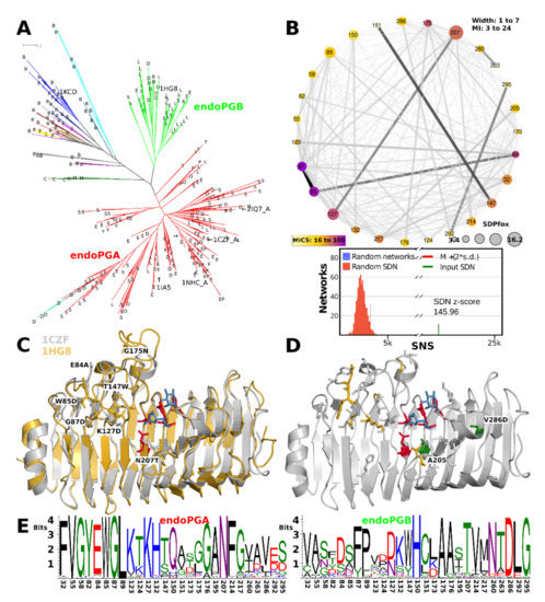 The HMMERCTTER clustering of the endoPG subfamily identifies two subfamilies with mostly ascomycete sequences, hereby declared as endoPGA and endoPGB, and a small subfamily with all mucoromycete and chytridiomycete sequences. A few basidiomycete sequences are found in the two major clusters, whereas the rest is clustered into 66 additional clusters (Figure 8A). We studied an eventual subfunctionalization of endoPG by comparing the two major clusters using SDPfox and identified a total of 62 CDPs that appear rather dispersed over the structure. Mutual information network analysis of the identified CDPs selected 27 SDPs (Figure 8B). We mapped the SDPs in 1CZF and 1HG8 as references for endoPGA and endoPGB, respectively. Six of the seven highest-scoring SDPs locate on one of the T3 loops that cover the N-terminal part of the groove, conceptually corresponding to sites −1 to −3 or −4 (Figure 8C). From the remaining SDPs two, Ala205 and Val286, map to PB1 on the C-terminal side of the enzyme, some other SDPs can be explained as possible compensation for the aforementioned SDPs, but no other SDPs that appear as possibly in contact with substrate were identified (Figure 8D, 205 is Alanine in both 1CZF and 1HG8). Figure 8E contains the SDP logos for the endoPGA and endoPGB subfamilies, showing overall considerable physicochemical differences. We suggest the common denominator X in its meaning of “unknown” or “unclassified” for all endoPGs that are not part of either the endoPGA or endoPGB subclasses.