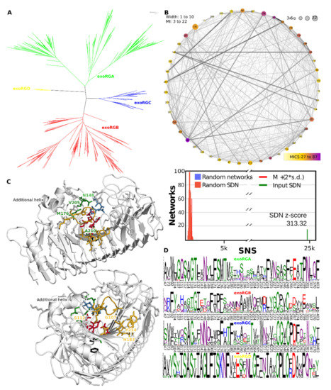 The analysis of all seven clusters resulted in an SDN with 36 SDPs (Figure 6). A total of 45 SDPs was identified when PGXC was left out of the major analysis (Supplemental Figure S8A). When larger clusters were considered, 18 SDPs were found (Supplemental Figure S8B), with 17 in the absence of PGXC (Supplemental Figure S8C). A total of 13 SDPs was identified in all four analyses (Supplemental Figure S7B). Network connectivity analysis determines a Mutual Information Connectivity Score (MICS) that weighs both the MI z-score of connections and the connectivity for each SDP. It then determines an optimal network for which the MI z-score is used as a cut-off. The SNS of the resulting Specificity Determining Network (SDN) has a z-score of 207.92 when compared in a distribution of 1000 randomly generated networks with otherwise similar characteristics. This indicates the network involves the more highly MI interconnected SDPs (Figure 6B). The logos corresponding to the SDPs in all sequences for each class reveal different patterns of subfamily specific conservation (Figure 6C). For example, SDP57 is very conserved in the PGXB subfamily (Ile90), but shows different degrees of variability in all other classes, although we typically observe hydrophobic residues in the homologous structures. SDP125 is very conserved in endoPGs (Lys125), variable in endoRGs (showing most commonly G or A), and with a substitution by R in all exoclasses and endoXG. SDP260 shows typically conserved bulky hydrophobic residues in exoclasses (e.g., Trp315 in PGXB) and endoXG (Tyr288), whereas it is variable in endoPG or not present at all in endoRG.