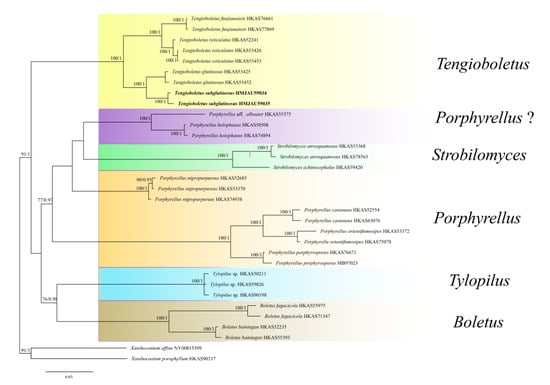 Tengioboletus was established by Wu et al. [5], including three species: T. glutinosus G. Wu & Zhu L. Yang, T. reticulatus G. Wu & Zhu L. Yang, and T. fujianensis N.K. Zeng & Zhi Q. Liang [5,34]. Tengioboletus can be distinguished easily from other Boletaceae genera by combining the following characteristics: a yellow context; hymenophore that change color when injured; tubes that are concolorous with the surface; cystidia that are scattered; subfusiform-ventricose or clavate shape; and an epithelium to ixotrichodermium pileipellis.