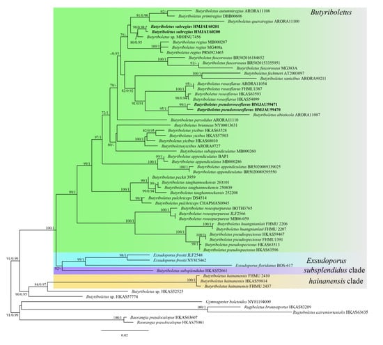 The four-locus dataset (ITS + 28S + tef1 + rpb2) of Butyriboletus (Supplementary File S2) consisted of 58 taxa and 3011 nucleotide sites (Figure 2). The alignment was submitted to TreeBASE (http://purl.org/phylo/treebase/phylows/study/TB2:S29034, accessed on 15 January 2022). Baorangia pseudocalopus (Hongo) G. Wu & Zhu L. Yang was chosen as the outgroup. The phylogram indicated our collections—HMJAU59471, HMJAU59470, and HMJAU60200, HMJAU60201—were grouped together respectively and formed two independent lineages with high support value (BP = 100, PP = 1 and BP = 99, PP = 1).