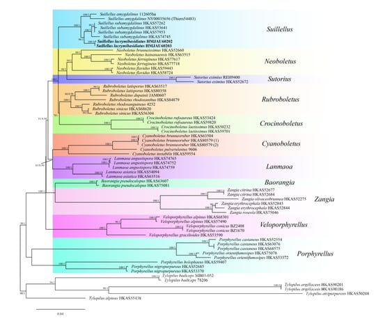Boletaceae Chevall. [1], a family with more than 70 genera, is one of the most prominent and diverse among the basidiomycetes [2]. It is mainly characterized by being tubulose with infrequent lamellate or loculate hymenophora, and by a fleshy context. Most Boletaceae species have value for humans and are essential for mutualistic symbiosis with trees [3,4,5,6]. Although the family Boletaceae was established nearly two centuries ago, the species diversity of the family increased significantly in the last few decades [7,8,9,10,11,12,13,14,15,16,17,18,19]. Because the morphology of Boletaceae has convergent characteristics, the classification did not correspond to the phylogeny of Boletaceae for a long time. With the development of molecular biology, the method of genealogical concordance phylogenetic species recognition (GCPSR) [20] was used to identify species of fungi, resolved some doubts about the status of taxa, and contributed to a better understanding of the relationships of the genera in this family [5,21,22]. In the past two decades, new genera and new species have rapidly increased, and the evolution of ectomycorrhizas of Boletales was gradually disclosed [23,24].
