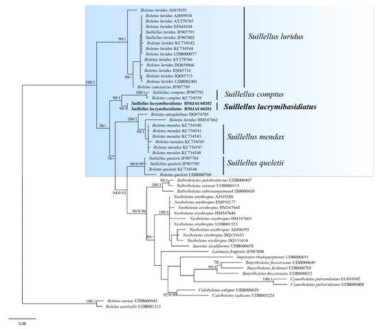 Notes: Suillellus lacrymibasidiatus is characterized by its oak brown to brownish orange pileus, the context staining blue when injured, and inamyloid basidiospores. Morphologically, S. lacrymibasidiatus is related to S. luridus (Schaeff.) Murrill, S. mendax (Simonini & Vizzini) Vizzini, Simonini & Gelardi, S. queletii (Schulzer) Vizzini, Simonini & Gelardi, and S. subamygdalinus Kuan Zhao & Zhu L. Yang. S. luridus is characterized by its prominent reticulation on the stipe and smaller basidiospores [71]; S. mendax is different from S. lacrymibasidiatus in its promptly bluing when pileus bruised, value of Q larger, and basidia clavate [13]; S. queletii can be distinguished from S. lacrymibasidiatus by its stipe wholly covered with fine granulation without reticulation, basidia clavate [72]; S. subamygdalinus is characterized by its basidia clavate [5]. Phylogenetically, S. lacrymibasidiatus is related to S. comptus. However, S. comptus differs from S. lacrymibasidiatus in its stipe surface staining blue when bruised, and smaller spores [71]. Among the other morphologically allied boletes, S. adalgisae (Marsico & Musumeci) N. Schwab [73], S. austrinus (Singer) Murrill [74], S. gabretae (Pilát) Blanco-Dios [75], S. luridiceps Murrill [76], and S. subvelutipes (Peck) Murrill. [77], none of them could represent a possible concurrent of S. lacrymibasidiatus.