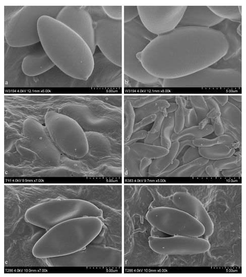 Basidiospores observed in the SEM. (a,b) Suillellus lacrymibasidiatus; (c) Butyriboletus subregius; (d) Butyriboletus pseudoroseoflavus; (e,f) Tengioboletus subglutinosus.