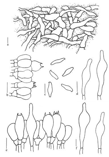 Tengioboletus subglutinosus. (a) Pileipellis; (b) Stipitipellis; (c) Basidiospores; (d) Cheilocystidia; (e,f) Pleurocystidia and basidia. Scale bars: 10 μm.
