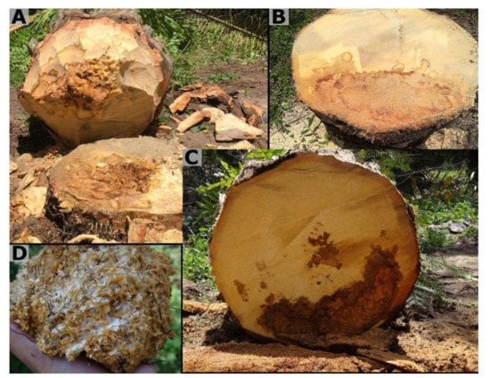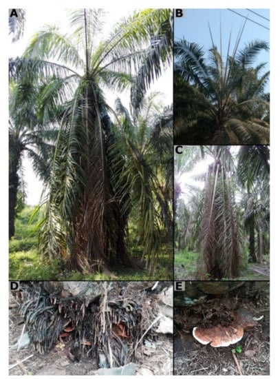 - Pilotti, C.A. Stem rots of oil palm caused by Ganoderma boninense: Pathogen biology and epidemiology. Mycopathologia 2005, 159, 129–137. [Google Scholar] [CrossRef]
