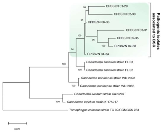 Castillo, S.Y.; Rodríguez, M.C.; González, L.F.; Zúñiga, L.F.; Mestizo, Y.A.; Medina, H.C.; Montoya, C.; Morales, A.; Romero, H.M.; Sarria, G.A. Ganoderma zonatum Is the Causal Agent of Basal Stem Rot in Oil Palm in Colombia. J. Fungi 2022, 8, 230. https://doi.org/10.3390/jof8030230