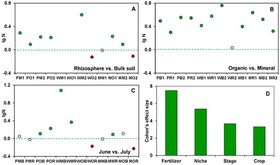 Differences in fungal gene copies abundances between the treatments compared. Comparisons are (A) rhizosphere/bulk soil, (B) organic/mineral fertilization, and (C) two periods of sampling. The green dots indicate significantly higher fungal abundances in soils under compared treatments, red dots indicate significantly lower abundances, and grey dots indicate no statistically significant differences between treatments (N = 3). All soil samples are indexed according to the scheme: plant–fertilizer system–soil niche–sampling period. The following indices were used for (I) the crop species: P— potato, W—white mustard, M—maize; (II) fertilizer systems: M—mineral, O—organic; (III) soil niches: B— bulk soil, R—rhizosphere; (IV) periods of sampling: 1—June, 2—July. (D) The contribution of the ecological factors (niche, fertilizer system, crop type, stage of plant development) into fungal gene copies abundances estimated using Cohen’s d effect size. The contributions of interaction effects among the ecological factors are presented in Table S2.
