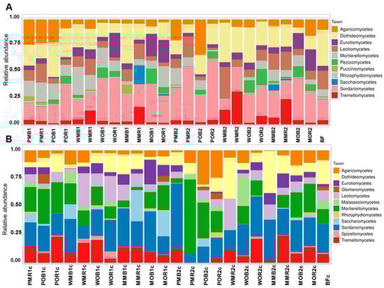 The structure of total (A) and active (B) fungal communities in the studied samples at the class level (the data are presented for phyla with abundances over 0.5%). All soil samples are indexed according to the scheme: plant–fertilizer system–soil niche–sampling period. The following indices were used for (I) the crop species: P—potato, W—white mustard, M—maize; (II) fertilizer systems: M—mineral, O—organic; (III) soil niches: B—bulk soil, R—rhizosphere; (IV) periods of sampling: 1—June, 2—July. The bare fallow is marked as BF. Acronyms of the RNA-based values have “c” indexes in titles.