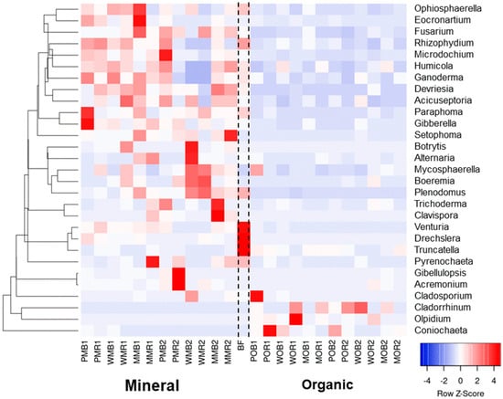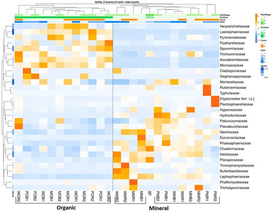 Relative abundances of top 30 fungal taxa in total (DNA) fungal communities of the considered treatments at the family level (N = 3). The data are given as Z-scores. Abundances of fungal classes with positive Z-scores are marked with orange color, abundances with negative z-scores are marked with blue color. All soil samples are indexed according to the scheme: plant–fertilizer system–soil niche–sampling period. The following indices were used for (I) the crop species: P— potato, W—white mustard, M—maize; (II) fertilizer systems: M—mineral, O—organic; (III) soil niches: B— bulk soil, R—rhizosphere; (IV) periods of sampling: 1—June, 2—July. The bare fallow without fertilizers is marked as BF.