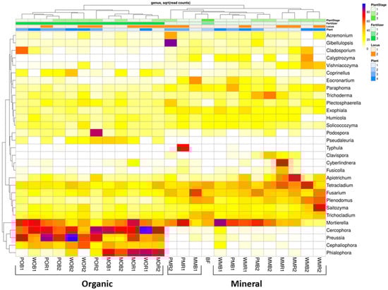 Relative abundances of top 30 fungal taxa in the total (DNA) fungal communities of the considered treatments at the genera level (N = 3). The data are given as square roots of the read counts. Abundances of fungal genera increase in a row: white–yellow–red–violet–dark blue. All soil samples are indexed according to the scheme: plant–fertilizer system–soil niche–sampling period. The following indices were used for (I) the crop species: P—potato, W—white mustard, M—maize; (II) fertilizer systems: M—mineral, O—organic; (III) soil niches: B—bulk soil, R—rhizosphere; (IV) periods of sampling: 1—June, 2—July. The bare fallow without fertilizers is marked as BF.