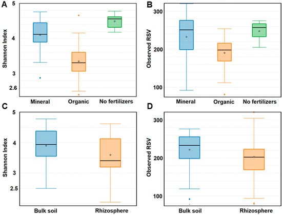 Alpha-diversity of bulk soil and rhizosphere mycobiomes. (A,B) Numbers of ribosomal sequence variants (RSV) and Shannon indexes when comparing all samples corresponding to mineral and organic fertilizer system (N = 36). (C,D) Numbers of RSV and Shannon indexes when comparing all rhizosphere and bulk soil samples (N = 36).