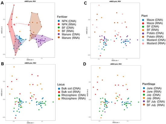Non-metric multidimensional scaling plots of soil fungal community assembly patterns using the Bray-Curtis (BC) distance matrix as related to (A) fertilizer system, (B) soil niche, (C) crop type, and (D) stage of plant development. The dotted arrows indicate the divergence of the bulk soil and rhizosphere mycobiomes under NPK and manure in opposite directions from the control without fertilizers.