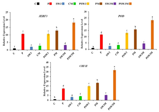 Expression profiles of the jasmonate and ethylene-responsive factor 3 (JERF3) and two defense-related genes, namely, peroxidase (POD) and chitinase class II (CHI II) in pea roots at 7 dpi, in response to treating with the seaweed extract and/or colonization with AMF, were determined using qPCR (Figure 1).