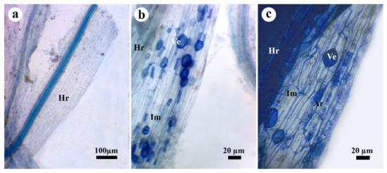 Pea root showing typical mycorrhizal structures. Where, (a) nonmycorrhizal root, (b) and (c) mycorrhizal roots, Hr = host root, Im = interaradical mycelia, Ve = vesicle, and Ar = arbuscule.