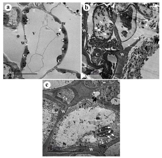 Transmission electron micrographs of pea roots infected with R. solani, colonized with arbuscular mycorrhizal fungi, and treated with the A. nodosum extract at 3%. Where (a) uninfected-untreated-nonmycorrhizal pea root showing normal cortical cell enclosed by a thin cell wall (W) and containing big vacuole (V), and a number of chloroplasts, with electron-dense plastoglobuli (arrowheads), (b) infected-untreated-nonmycorrhizal pea root showing a disorganized cell enclosed with a thick cell wall (W) and cell membrane (short arrow), abnormal chloroplast (C), big nucleus (N) containing electron-dense bodies (arrowheads), and a big vacuole (V). Note the disintegrated cell wall (long arrow) and the cytoplasmic components leaked out of the raptured cell, and (c) mycorrhizal pea root which infected with R. solani and treated with the A. nodosum extract at 3% showing well-organized cell with thick cell wall (W) and cell membrane (short arrow), big chloroplasts (C) containing starch granules (wide arrows), granulated cytoplasm, big vacuole (V) and normal nucleus (N).