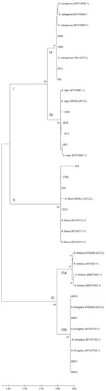 - Palumbo, J.D.; O’Keeffe, T.L. Detection and discrimination of four Aspergillus section Nigri species by PCR. Lett Appl. Microbiol. 2015, 60, 188–195. [Google Scholar] [CrossRef] [PubMed]