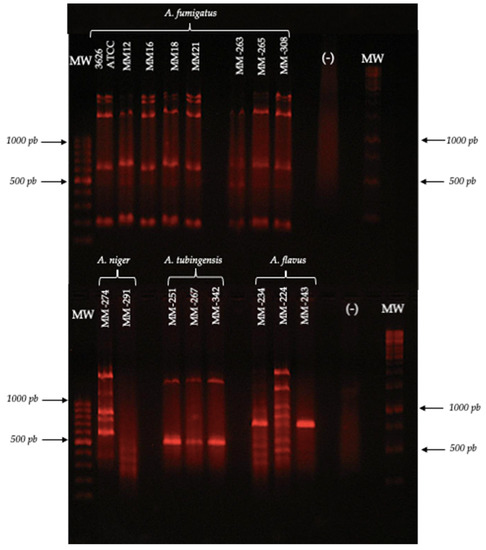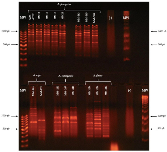 The primer OPA-19 generated a unique pattern for A. fumigatus, while, for the rest of the species, the patterns obtained with this same primer showed a lower number of bands, as in the case of A. tubingensis, which presented two bands of 500 and 1600 bp.