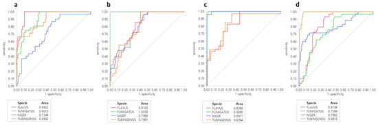 Figure 3 shows the results of the ROC curves obtained for the selected primers, where a species-specific correlation was observed with areas greater than 0.95 for the following primers: OPC-06, with an area of 0.9632 for A. flavus; OPF-01, with an area of 1.0000 for A. fumigatus; OPF-07, with an area of 0.9971 for A. niger and OPG-13, with an area of 0.9810 for A. tubingensis.