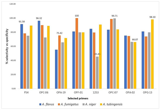 To carry out the qualitative and quantitative comparison between the selected isolates, a sensitivity vs. specificity graph was constructed based on the data obtained from the ROC curves. The graph shows that the percentages of sensitivity vs. specificity vary regarding the qualitatively selected primers compared with those selected quantitatively. The following values were obtained for each of the evaluated species: for A. flavus, the primer P54 showed 91.58%, while for OPC-06, 96.32% was obtained; for A. fumigatus, the primer OPA-19 presented 75.42% against the primer OPF-01, which was 100%; for A. niger, the primer 1253 showed 45.45%, while the primer OPF-07 obtained 99.71% and finally, for A. tubingensis, the primer OPA-02 presented 66.07%, while for the primer OPG-13, 98.10% was obtained. Figure 4 shows the percentages of sensitivity vs. specificity of the qualitatively and quantitatively selected primers concerning the Aspergillus spp. evaluated.