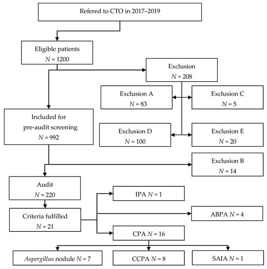 The following data were collected: age, sex, initial assessments on referral, exposure to asbestos/work-related lung hazards/tuberculosis/mold, use of narcotics/alcohol/tobacco, PFT, medication, comorbidities, symptoms, biochemistry, CT/PET-CT imaging findings, cytology, histology, microbiology, CTO, and MDD diagnosis when performed. Diverse diagnoses were identified by the use of registered ICD-10 codes in the EPJ, including codes for tentative or verified pulmonary aspergilloses with DB44 (“aspergillosis”). Included patients were followed for relapse/remission of malignancy, as well as additional examinations for cancer, tuberculosis, and CPA until 31 December 2019, distinguishing between examinations continued from CTO outcome or initiated independently. Pre-audit data were limited to patients with first-time examination for malignancy at CTO between 2017 to 2019. Patients who died during or after examination had their date of death registered regardless of whether it was later than 31 December 2019.