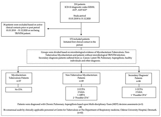 The primary outcome of this study was the incidence of CPA in TB and NTM patients. The secondary outcome was the CPA incidence of the included population. The study population was grouped for comparative analysis based upon microbiological evidence of mycobacterium tuberculosis and non-tuberculous mycobacterium or classified as Secondary Diagnosis (SDG); see Figure 1 for further details.