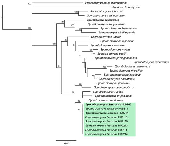 Sporobolomyces lactucae cultures were deposited in the USDA-ARS Collection (NRRL) and the Westerdijk Fungal Biodiversity Institute (CBS). Sequence data are available via GenBank (NCBI), and aligned data sets are available on TreeBase (Project number 29521; http://purl.org/phylo/treebase/phylows/study/TB2:S29521, accessed on 27 January 2022).