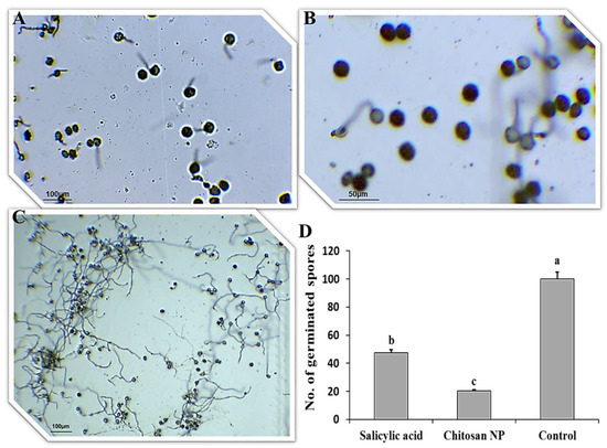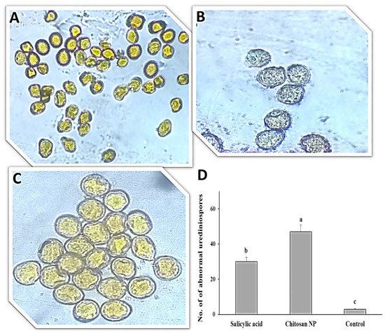 3.1. Effect of Chitosan Nanoparticles and Salicylic Acid on Urediniospores Germination