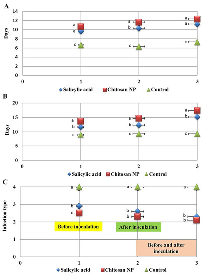 3.4. Effect of Chitosan Nanoparticles and Salicylic Acid on Disease Symptoms