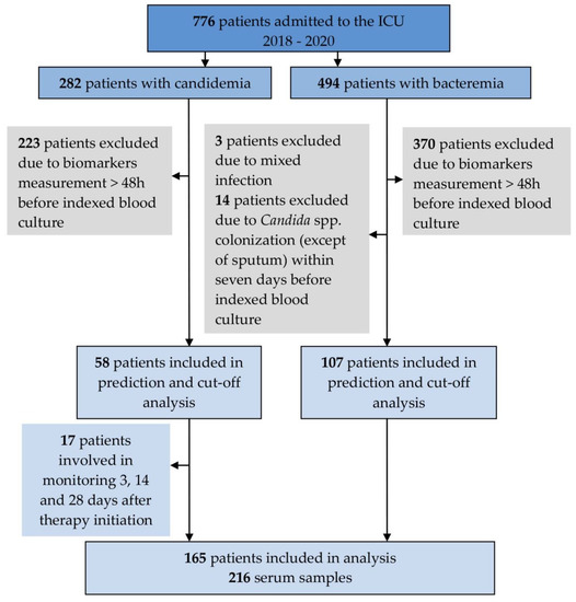 This multicenter retrospective observational cohort study included patients aged > 18 years admitted to ICUs in three centers (University Hospital Ostrava, City Hospital Ostrava, Havířov Hospital) between January 2018 and December 2020. Their enrollment was based on clinical suspicion of sepsis due to severe organ dysfunction, indicated by an increase in the Sequential Organ Failure Assessment Score (SOFA, sepsis-related) of 2 or more, together with a confirmation of IC following the European Organization for Reseasrch and Treatment of Cancer and the Mycoses Study Group Education and Research Consortium (EORTC/MSGERC) consensus definitions [12]. Data recorded for individual patients included: a reason for ICU admission, age, sex, surgical, traumatic, or medical patient type, Candida colonization (indicated by one or more Candida-positive cultures from non-sterile sites), SOFA score [13,14], Acute Physiology and Chronic Health Evaluation II score [15,16], serum creatinine concentration, and information about the following binary variables: diabetes mellitus status, Central Venous Catheter (CVC) introduced for more than 48 h, renal replacement, and corticosteroid therapy. Neutropenic and transplanted patients were excluded due to the minimal size of the respective cohort. The study was part of a registered clinical trial evaluating biomarkers for early diagnosis of sepsis in patient groups with culture-confirmed candidemia or bacteremia to identify suitable cut-off concentrations for a biomarker panel.