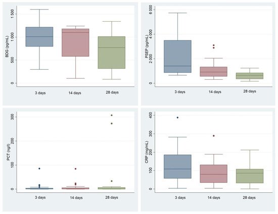Supplementary Table S4 shows that the marker exhibiting the most significant change after initiating echinocandin therapy was PSEP, whose concentration fell significantly (p = 0.0012, Wilcoxon signed-rank test) within 14 days (Figure 3). Conversely, serum BDG and CRP concentrations only decreased significantly 28 days after initiating echinocandin therapy (p = 0.0038 and p = 0.03, respectively). The concentration of PCT did not change over the 28 days in the candidemia group.
