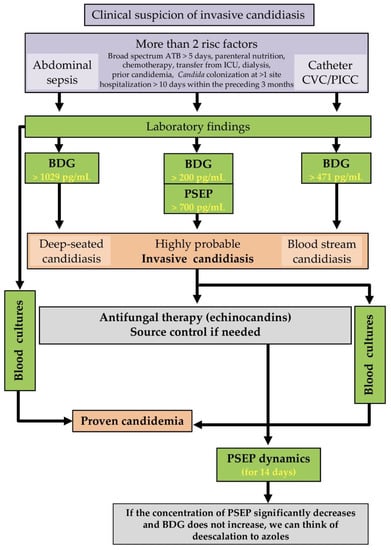 The use of PSEP and BDG could be helpful in the diagnostic workflow for critically ill patients with probable invasive candidiasis and for guiding antifungal therapy, including highlighting cases where early initiation is warranted and choosing a duration and de-escalation. The advantage of PSEP as a biomarker is that its concentration can be determined within 15 minutes using the Pathfast method. However, further studies are needed to determine whether this could significantly impact the use of PSEP and BDG in the diagnostic algorithm for non-neutropenic and non-transplanted ICU adults at risk for invasive candidiasis and/or candidemia.
