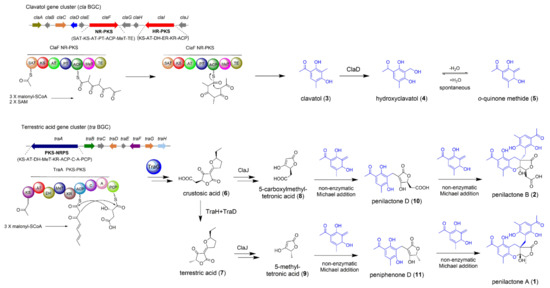 The representative examples about non-enzymatic Michael addition mediated the coupling process of polyketide–polyketide hybrids were highly oxygenated fungal polyketides penilactones A (1) and B (2), which were firstly isolated from an Antarctic deep-sea derived fungus Penicillium crustosum PRB-2 by Li and co-workers [12]. The biosynthetic pathway was proposed to be originated from the hybridization of one o-quinone methide unit (5) and a γ-butyrolactone moiety through 1,4-Michael addition to complete the carbon skeleton construction of 1 and 2. A biomimetic total synthesis was subsequently achieved to confirm the biosynthetic hypothesis [13]. Considering the enzymes for Michael addition involved in 1 and 2 biosynthesis have not been reported yet, Li and co-workers identified two separate BGCs (termed as cla and tra BGCs in this review) responsible for the biosynthesis of 1 and 2 through the gene deletion and heterologous expression in Aspergillus nidulans [14]. The core non-reducing polyketide synthase (NR-PKS) ClaF in the cla BGC is responsible for the biosynthesis of crucial intermediate clavatol (3) (Figure 1). The nonheme FeII/2-oxoglutarate-dependent oxygenase ClaD oxidized 3 into hydroxyclavatol (4), which spontaneously underwent dehydration into the crucial intermediate o-quinone methide (5). For tra BGC, a hybrid polyketide synthase-nonribosomal peptide synthetase (PKS-NRPS) TraA and a trans-acting enoyl reductase (ER) TraG collaboratively catalyzed the formation of crustosic acid (6) precursor. The nonheme FeII/2-oxoglutarate-dependent oxygenase TraH subsequently catalyzed the oxidative decarboxylation of 6 into dehydroterrestric acid, the terminal double-bond of which was finally reduced by the flavin-dependent oxidoreductase TraD into an important intermediate terrestric acid (7) [15]. The results of precursors feeding experiments in ΔtraA mutant confirmed that both 6 and 7 were the on-pathway intermediates, and could be transformed into 5-carboxylmethyltetronic acid (8) and 5-methyltetronic acid (9), respectively. The fascinating issue associated with the biosynthesis of 1 and 2 is which enzyme(s) could catalyze the Michael addition to couple two building blocks together. Surprisingly, incubation of 8 with 4 in water at 25 °C led to the formation of penilactone D (10) as the major product, and 2 as the minor product (Figure 1). Incubation of 9 with 4 generated peniphenone D (11) as the major product as well as 1 as the minor product. Both 10 and 11 were separately incubated with 4, the formation of 1 and 2 could be observed (Figure 1). These results unambiguously indicated that the Michael addition involving in the biosynthesis of 1 and 2 is nonenzymatic and could happen spontaneously.
