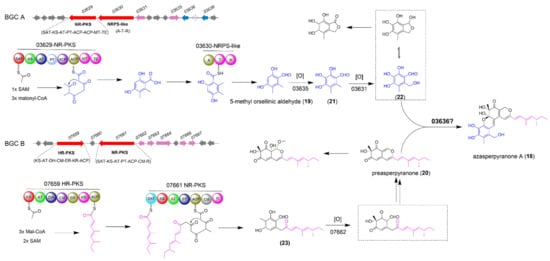 Azaphilones, a group of structurally related fungal polyketides, contain a highly oxygenated bicyclic pyrone quinone moiety, and exhibit a broad range of bioactivities including anticancer, antifungal, and antiviral activities [23]. Azasperpyranone A (18), recently isolated from A. terreus, contains a highly oxygenated pyranoquinone moiety possessing a 6/6/6/6 tetracyclic ring system, and shows potential anticancer activity [24]. Scrutiny of the structural feature of azasperpyranone An (18) revealed that two building blocks 5-methyl orsellinic aldehyde (19) and preasperpyranone (20) are the biosynthetic precursors. Lu and co-workers have identified two separate BGCs by gene deletion, including the BGC A responsible for polyhydric phenol formation and the BGC B involving the azaphilonoid scaffold construction (Figure 3) [24].