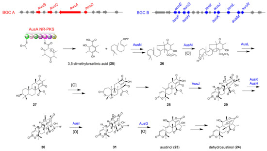 Meroterpenoids are an important class of fungal NPs [28], some of them have been developed as the drug candidate for treatment of Alzheimer’s disease such as territrem [29], and the drug lead for insecticide such as pyripyropene A [30]. Fungal meroterpenoids are usually biosynthesized by a single BGC which encodes a polyketide synthase, a terpene cyclase, a prenyltransferase, and other essential tailoring enzymes to produce polyketide and terpenoid precursors [31]. Deletion of sumO gene, encoding the small ubiquitin-like protein SUMO, significantly altered the profiles of secondary metabolites in A. nidulans. Austinol (23) and dehydroaustinol (24) were identified from the ΔsumO mutant [32]. Nielsen et al. first reported the NR-PKS AusA responsible for the formation of polyketide precursor 3,5-dimethylorsellinic acid (DMOA) (25) in austinol biosynthesis [33]. This conclusion was also verified by Wang et al. [34]. Interestingly, Wang and co-workers found that no prenyltransferase gene was located near NR-PKS gene ausA, which suggested that the genes responsible for the biosynthesis of 23 and 24 might be separated in the genome of A. nidulans LO2026 [34]. Using the UbiA sequence as a query to blast the prenyltransferase homologs in the genome of A. nidulans, Wang et al. found the top two candidate genes AN9259.4 (designated as ausN, on chromosome VIII) and AN8142.4. Deletion of ausN abolished the production of 23 and 24, and accumulated the polyketide precursor 25. By a set of gene deletions around ausA and ausN, they identified the two separate BGCs: the BGC A containing the necessary genes ausA-D and the BGC B consisting of the biosynthetic genes ausE-N. The biosynthetic pathway for 23 and 24 was also proposed (Figure 4). Firstly, the polyketide synthase AusA is responsible for the formation of 25, then the aromatic prenyltransferase AusN catalyzed the C-alkylation of 25 using farnesyl pyrophosphate to form intermediate 26. The epoxidase AusM catalyzed the epoxidation of the prenylated polyketide intermediate 26, followed by cyclization catalyzed by a terpene cyclase AusL to form the tetracyclic intermediate 27. The formation mechanism of the lactone system and spiro-ring in compound 28 has been investigated by Abe group [35]. The co-operation of the non-heme iron-dependent dioxygenase AusE, the hydroxylase AusB, and the Baeyer–Villiger monooxygenase AusC transformed the substrate 27 into 28 [35]; The hypothetical protein AusJ might be responsible for the acid-catalyzed keto-rearrangement and ring contraction of the tetraketide portion in intermediate 28 to generate intermediate 29. The authors speculated that the AusK is responsible for reducing the C-5′ keto of 29 to hydroxyl group, and the hypothetical protein AusH might function as an accessory enzyme collaboratively working with AusK to alter AusK stereospecificity for its product 30. The Baeyer−Villiger monooxygenase AusI inserted an oxygen atom between the C-4′ and vicinal carbon at C-3′ of 30 to create a lactone ring in 31. Finally, the P450 monooxygenase AusG might catalyze the C-11 hydroxylation of 31 to form final product austinol (23) (Figure 4).
