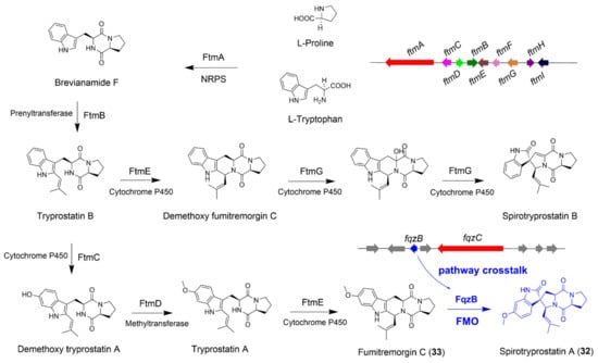 The biosynthetic pathway of fungal non-ribosomal peptide spirotryprostatin A (32). The FMO FqzB from the fqz BGC catalyzes the formation of spiro-carbon in spirotryprostatin A.